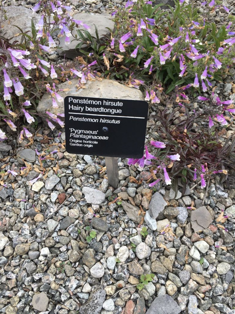 Penstemon hisurtus, appelé barbe poilue en français, originaire des zones montagneuses d’Amérique du Nord, est une plante vivace facile de culture, adaptée aux sols pauvres et rocailleux et bien drainés.  Pygmaeus en est la variété naine et s’intègre très bien dans une auge.  Ses fleurs en clochettes, mauves à l’extérieur et blanches à l’intérieur, disposent de coloris plus ou moins vifs et lumineux en garnissent la hampe sur toute sa hauteur. Les hampes florales s’épanouissent sur des tiges dressées bien droites qui émergent de la touffe de feuilles.